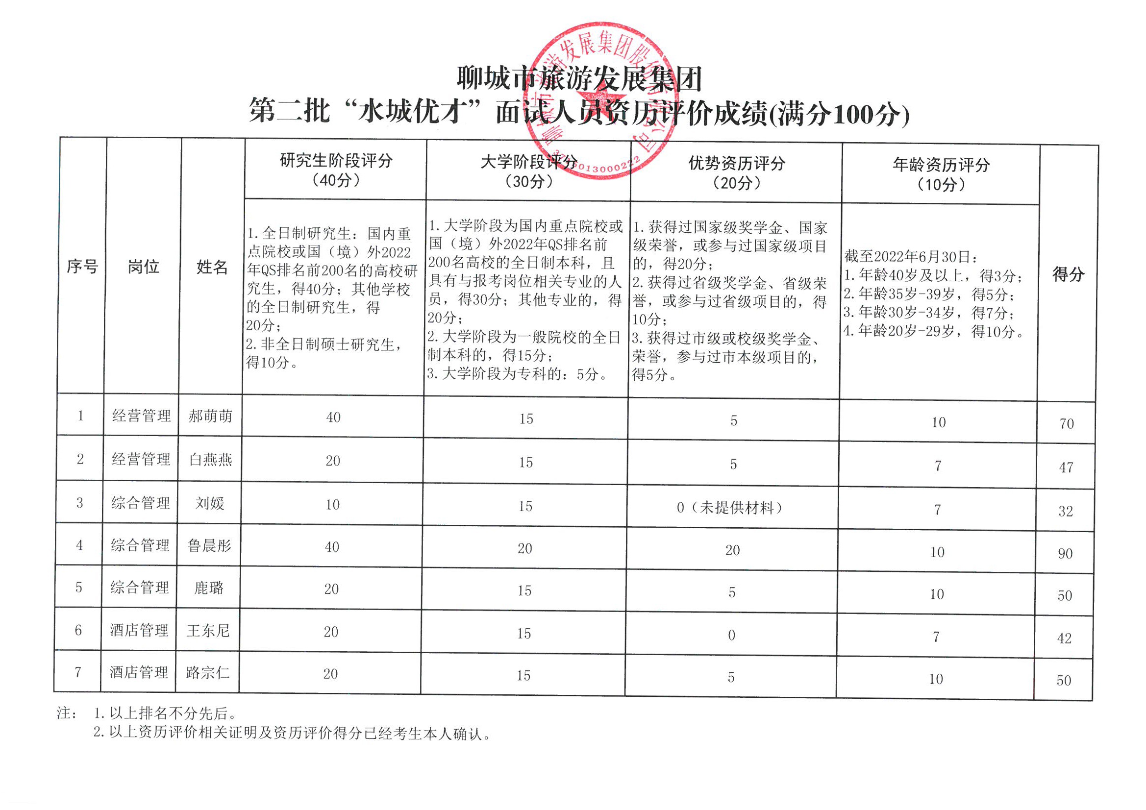 聊城市旅游發(fā)展集團 第二批“水城優(yōu)才”面試人員資歷評價成績(滿分100分)