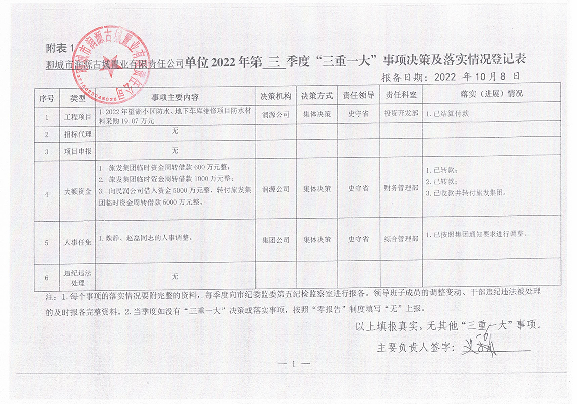 2022年潤(rùn)源公司第三季度“三重一大”事項(xiàng)決策及落實(shí)情況登記表